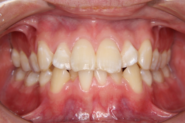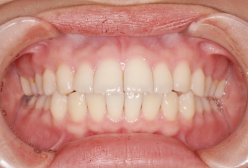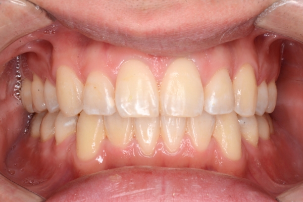 上下顎の叢生量(ガタガタの量)が中等度で、上顎前歯が唇側に傾いてとび出ていたので、そうした問題を改善するために小臼歯の抜歯が必要と診断しました。初診時の口元のライン(Eーライン)がきれいでしたので、治療過程で口元が引っ込みすぎないように注意しました。治療後は噛み合わせが良くなり、口元のラインも概ね維持ができたため、患者さまにも非常に満足していただけました。