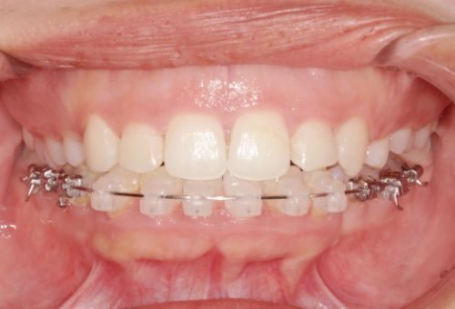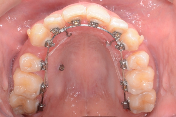 下の歯には表側に装置をつけますが、審美性に配慮したセラミックブラケットとホワイトワイヤーを使用します。