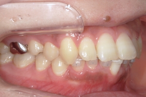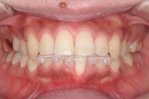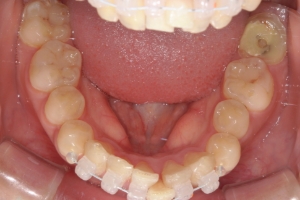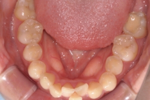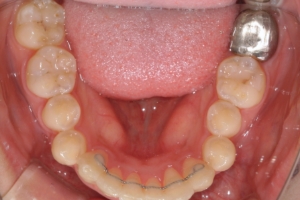 奥歯の噛み合わせは良好で、尚且つガタガタの量が中程度でしたので、部分矯正の適応と診断しました。この方は上の前歯の並びが概ね綺麗だったので、装置は下の前歯のみでの治療が可能でした。