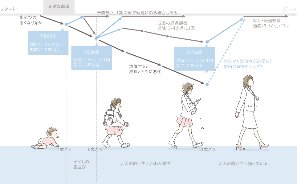 子どもの矯正治療は、予防矯正、1期治療、2期治療の3つの段階に分かれています。